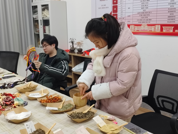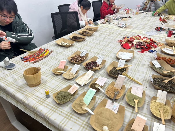 非遗体验区是感受传统文化的热门打卡地。学子们参照壮锦配色绘制非遗民族扇,研磨药材制作兼具实用与文化的中药香囊,挥毫书写马年寄语并以金箔装饰金箔卷轴,一笔一画皆是对新年的期许,在动手实践中领略中华优秀传统文化的魅力。